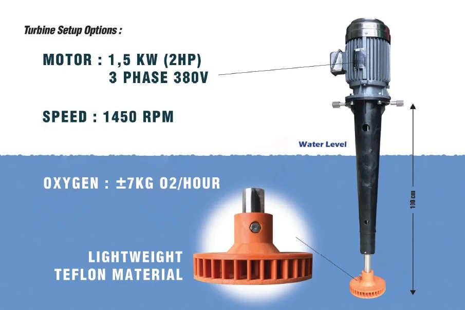 Penyediaan oksigen dalam proses pengolahan limbah merupakan sumber energi untuk bakteri pengurai. Pilihan PBI untuk aerator adalah SATT300 . SATT300 Aerator merupakan jet aerator yang efisien, mudah dioperasikan, dan tahan lama. Teknologi ini dapat membuat gelembung oksigen kecil yang banyak. Semakin kecil gelembung yang tersedia, semakin luas permukaan yang dapat menjangkau bakteri di dalam kolam. Semakin banyak gelembung tersebut tersedia, semakin baik pula kinerja bakteri pengurai. Efisiensi transfer oksigen SATT300 +/- 7 kg O2/kW. jam. SATT300 mempunyai bagian-bagian yang dinamis sehingga intensitas pergerakan dari impeller yang terus menerus tidak berdampak pada daya tahan aerator. SATT300 adalah pilihan aerator yang tepat.