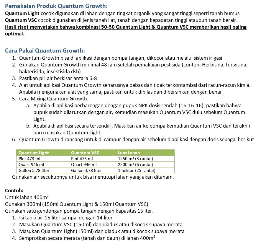 Quantum-VSC (QVSC) adalah pupuk hayati tunggal yang mengandung bakteri vegetative spora dan asam humat untuk membantu penguraian bahan organic di tanah. Mengandung humus gambut yang berkualitas tinggi yang dapat membantu dalam mempercepat respon microbiologi untuk mengurai sampah organik untuk dijadikan nutrisi untuk tanaman. Asam Humat dikenal untuk mengikat lebih dari 50 elemen dari tabel periodik, termasuk Na, Cl dan ion lainnya. Oleh karena itu, molekul-molekul organik juga dapat bertindak sebagai penyangga dalam tanah untuk mengurangi toksisitas garam tinggi dengan mengikat mereka, sekalian membantu untuk mengembalikan keseimbangan alami ion dalam tanah dan pertumbuhan yang lebih baik.